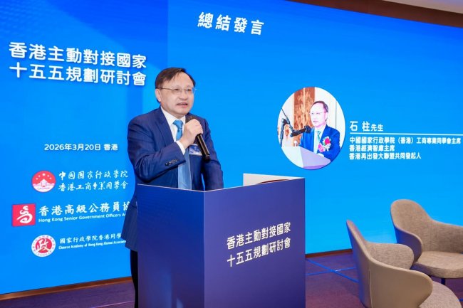 由中國國家行政學院(香港)工商專業同學會、香港高級公務員協會、國家行政學院香港同學會、香港公務員總工會、香港特區政府公務人員聯會、香港經濟智庫聯合主辦、230位香港政界和工商界代表出席的「香港主動對接國家十五五規劃研討會」3月20日在香港舉行,石柱在會上發出上述呼籲。全國人大常委會委員、香港立法會主席李慧琼,香港特區政府特首政策組組長黃元山,香港中聯辦經濟部副部長呂峰担任主禮嘉賓。